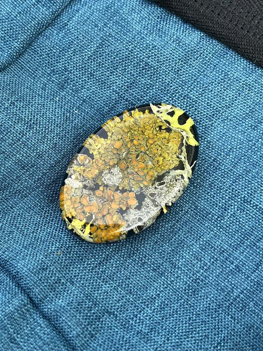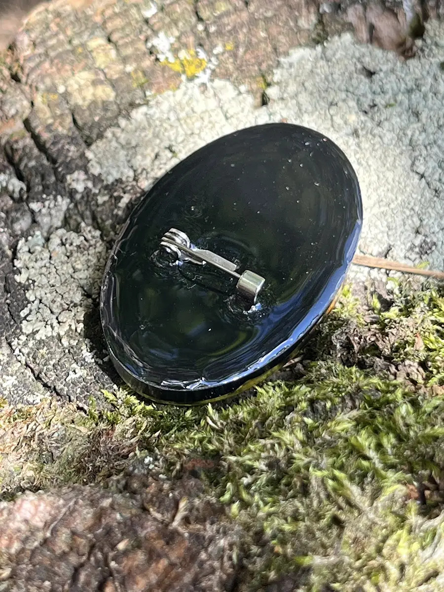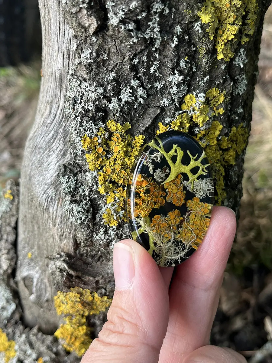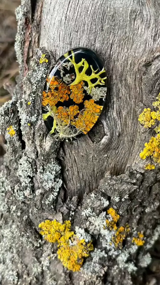 Originální brož, která v sobě ukrývá kouzlo lesa. Ručně vytvořený šperk spojuje eleganci jednoduchého designu s jedinečnou krásou přírodnin. V čiré pryskyřici jsou zalité kousky lišejníků a terčovníku, jejichž struktury a barvy vynikají na tmavém podkladu. Každý kus je jedinečný – odstín i tvar lišejníků se u jednotlivých broží liší, což zaručuje neopakovatelný charakter. Praktické zapínání umožňuje snadné připnutí na oděv, šálu či tašku.
