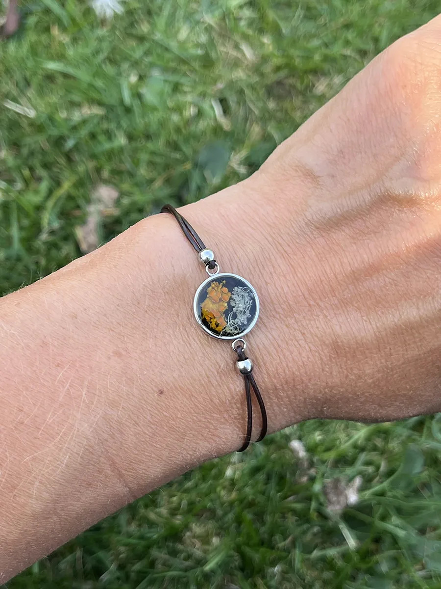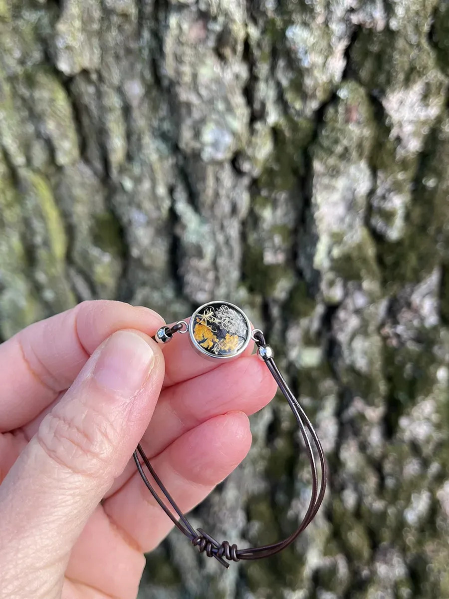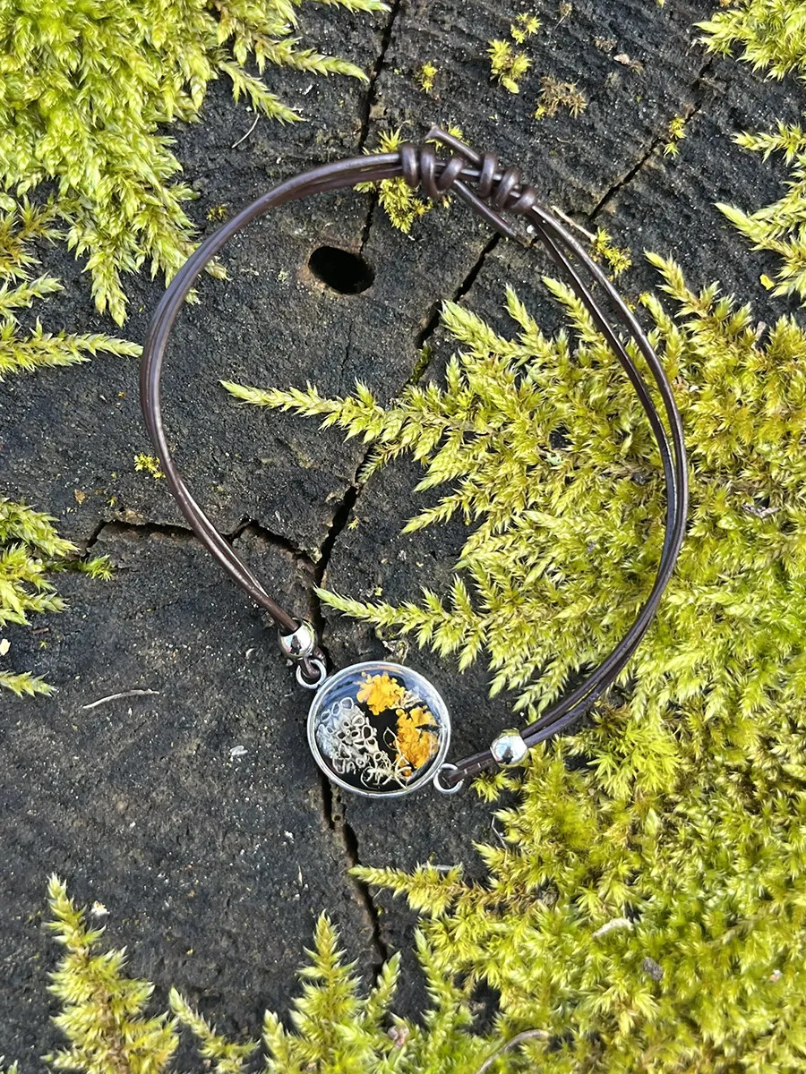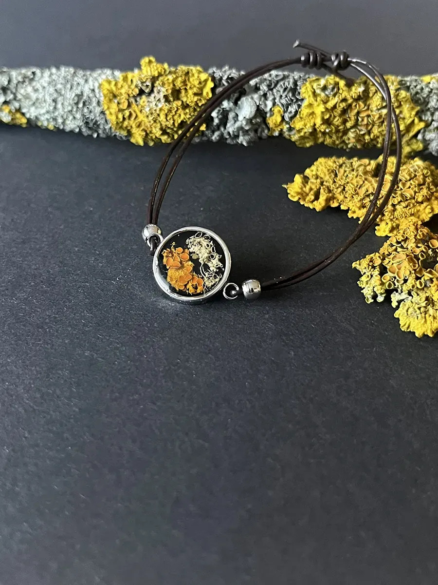 Kulaté kovové lůžko je zalité čirou pryskyřicí, ve které je zachycen lišejník Terčovník zední. Minimalistický a elegantní doplněk, který podtrhne přirozenou krásu každého outfitu a skvěle poslouží jako dárek milovníkům přírody.