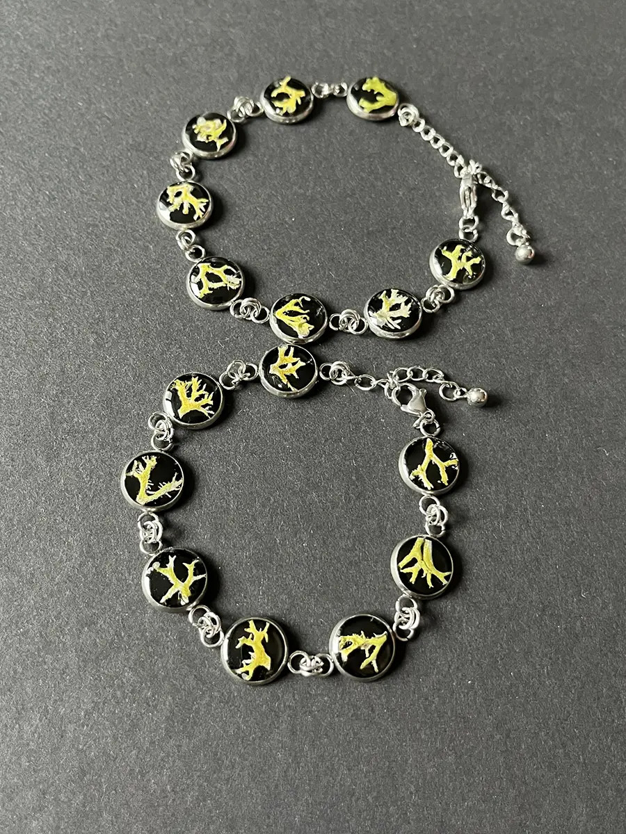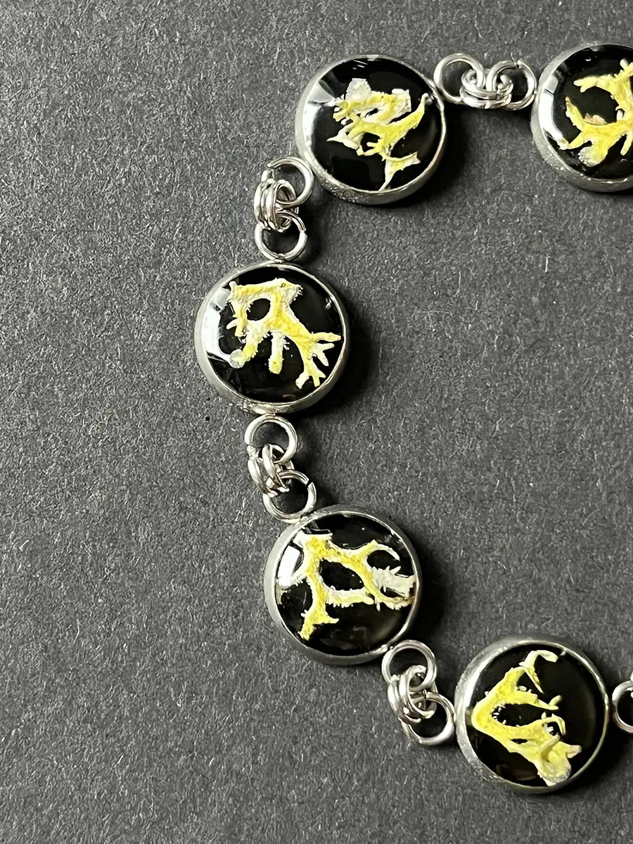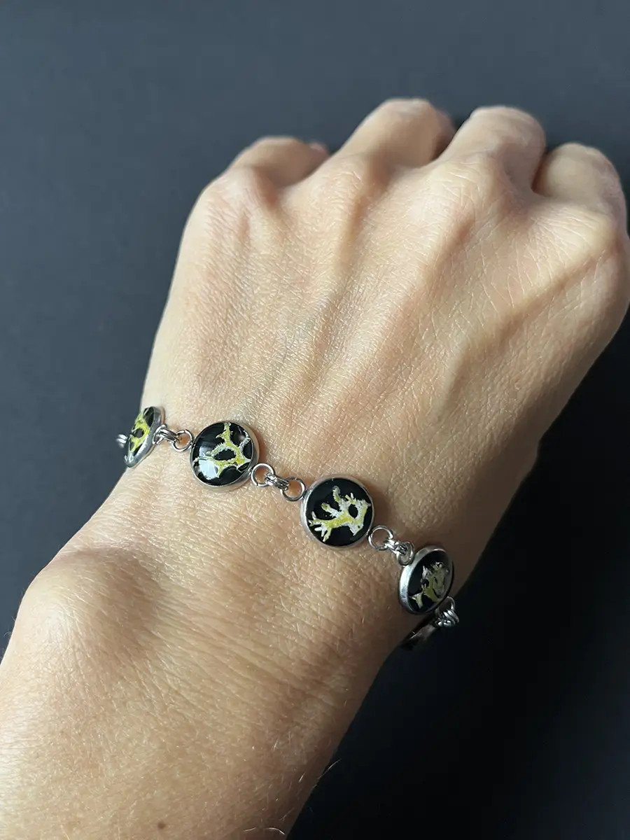 Jemný náramek, který propojuje krásu divoké přírody s jednoduchým a elegantním designem. Série kulatých lůžek ukrývá drobné kousky lišejníku Větvičníku zalité v čiré pryskyřici. Zapínání na karabinku s možností délkového prodloužení zajišťuje pohodlné nošení. Každý náramek je jedinečný – odstín i tvar lišejníku se u jednotlivých kusů lehce liší, což dodává šperku neopakovatelný charakter.