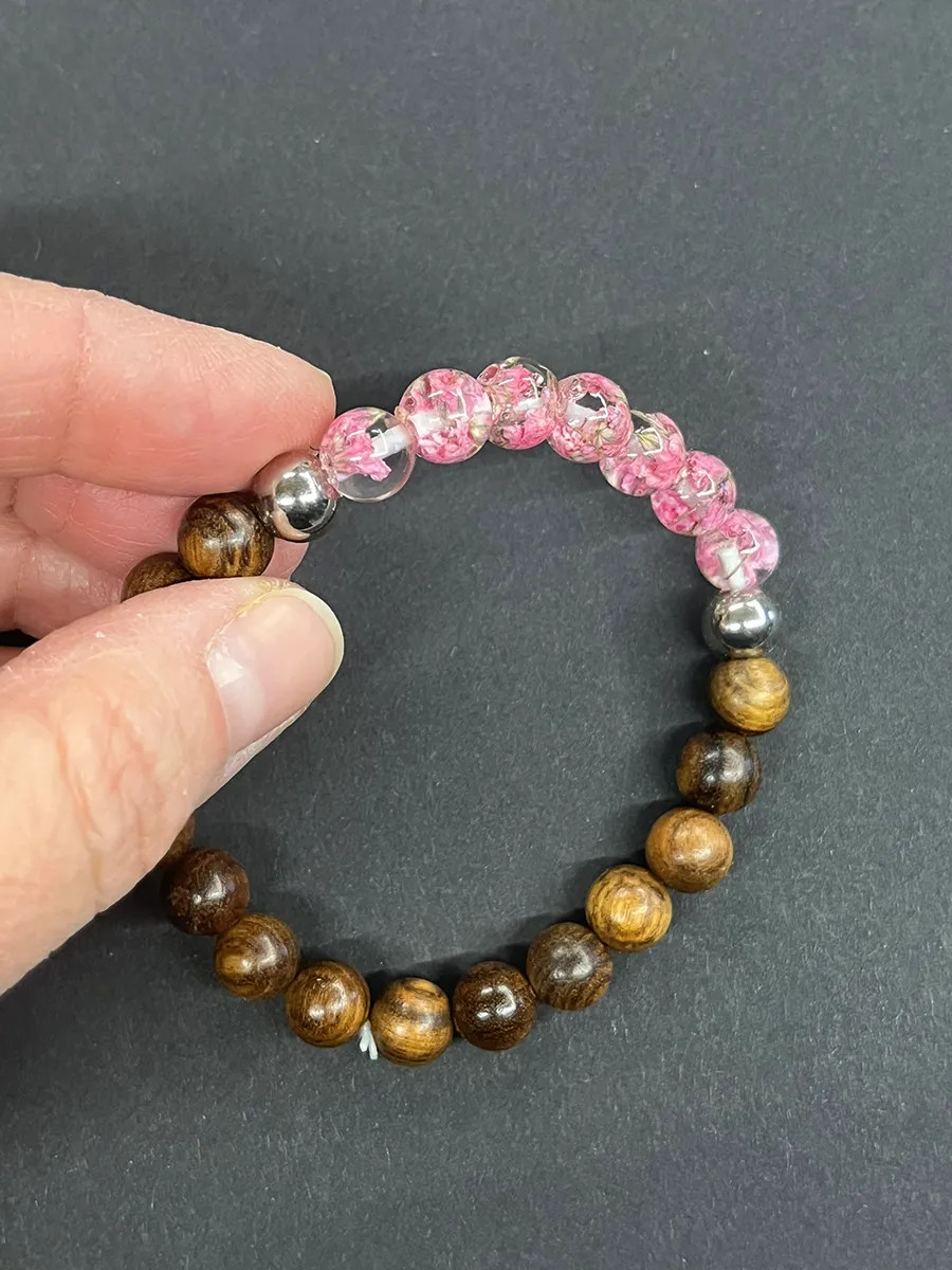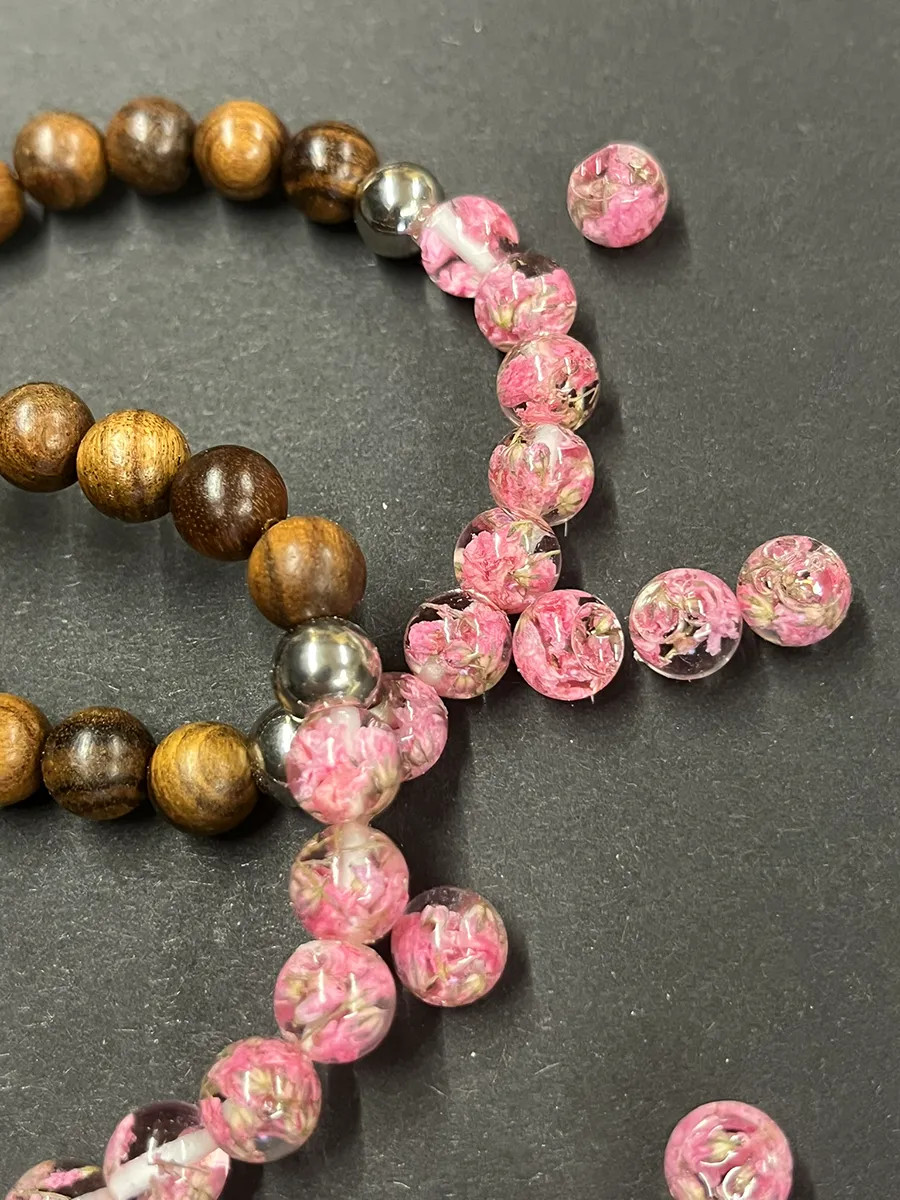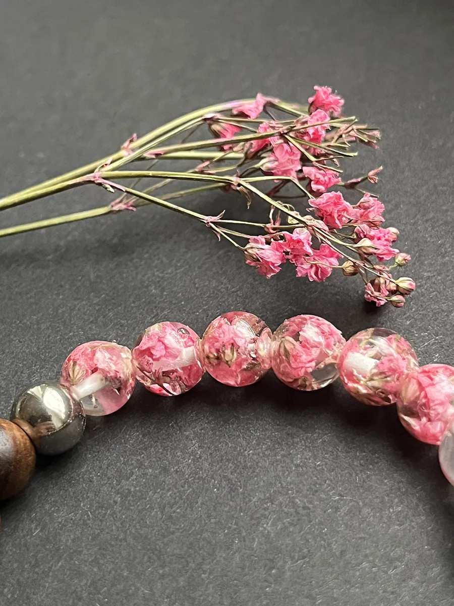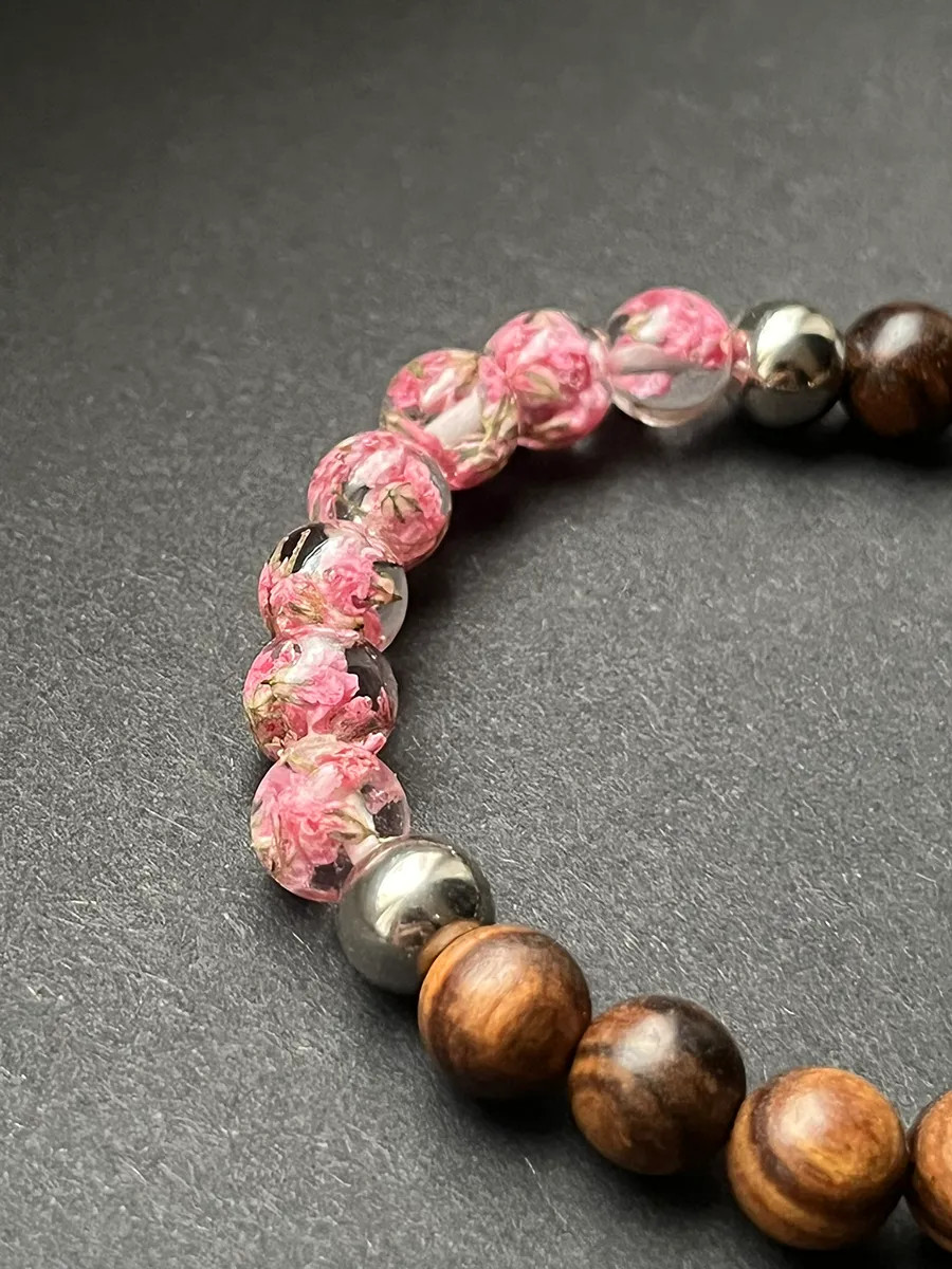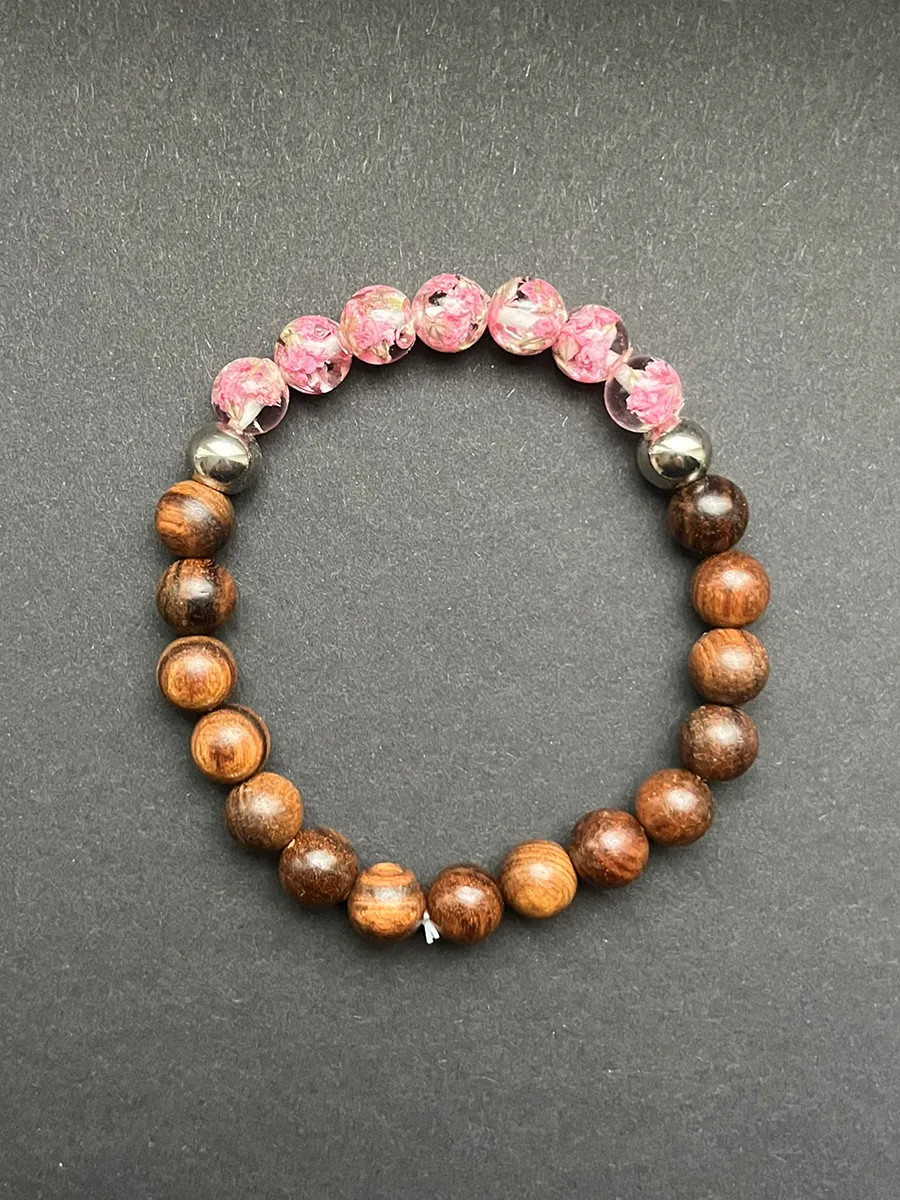 Jedinečný náramek, který propojuje sílu přírody a jemný design. Kombinace dřevěných Palisandrových korálků, dvou lesklých kovových korálků a průhledných perel s kvítky Nevěstina závoje vytváří harmonii přírodních tónů a barev. Náramek působí přirozeně, elegantně a díky bílé elastické pružence se pohodlně nosí. Každý kus je originál, protože příroda se nikdy neopakuje.