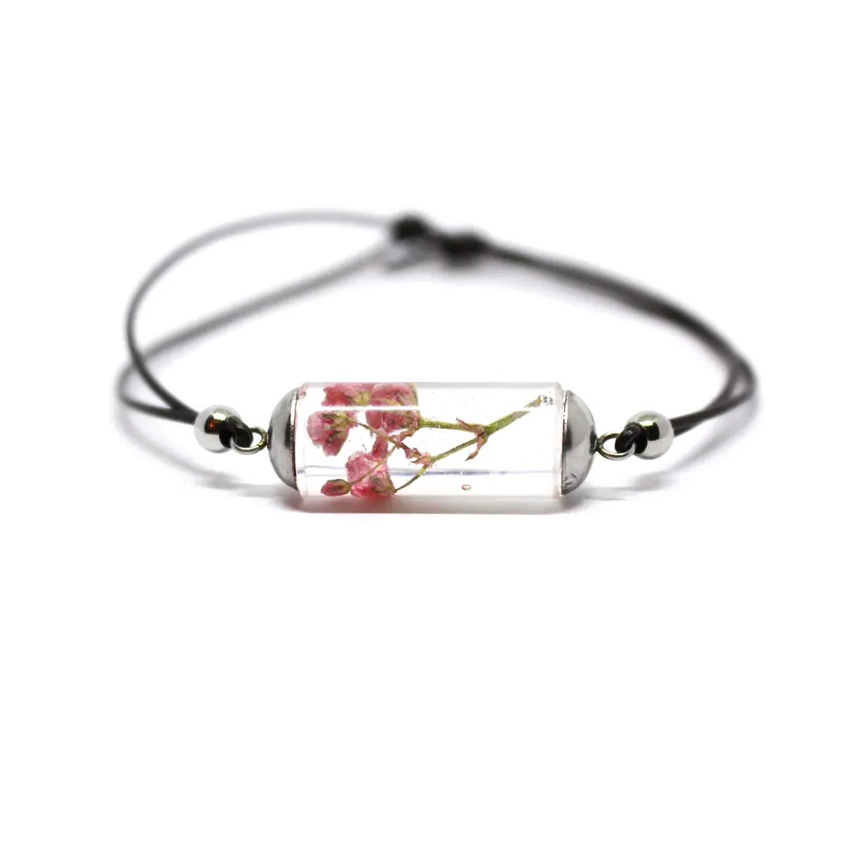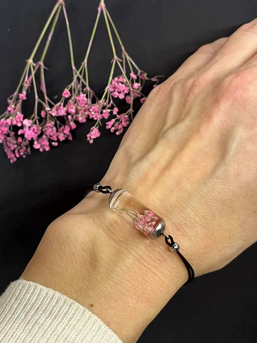 Náramek ukrývá skutečné květy nevěstina závoje (Gypsophila), pečlivě zalité do čiré pryskyřice ve tvaru elegantního válečku. Průhledné provedení nechává vyniknout jemné růžové kvítky a jejich přirozenou křehkost.