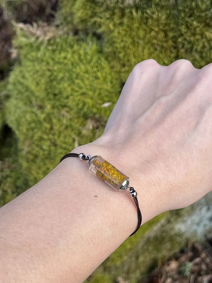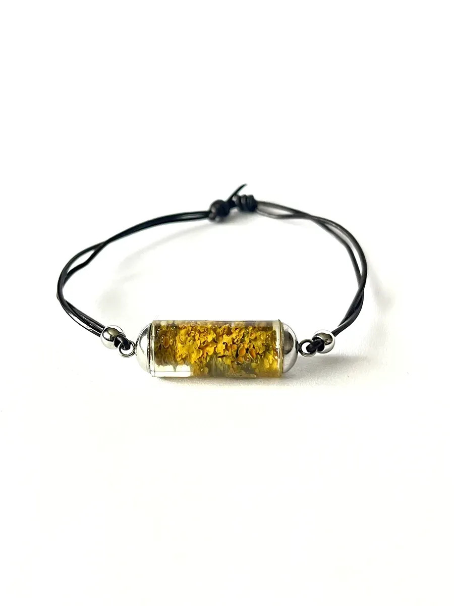 Elegantní náramek ve tvaru válečku zachycuje krásu lišejníku Terčovníku zedního v čiré pryskyřici. Ručně vyráběný šperk s minimalistickým designem přináší kousek přírody do vašeho outfitu a je ideální jako originální doplněk pro každodenní nošení i slavnostní příležitosti.