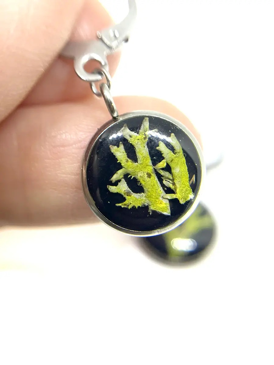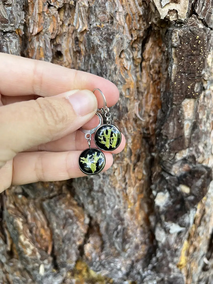 Výrazné náušnice, ve kterých je zachycen skutečný lišejník Větvičník. Zalitou pryskyřicí působí jako malý přírodní obraz, který vyniká svou jedinečnou strukturou i barvou. Každý pár je originál a nese v sobě neopakovatelný kousek přírody.