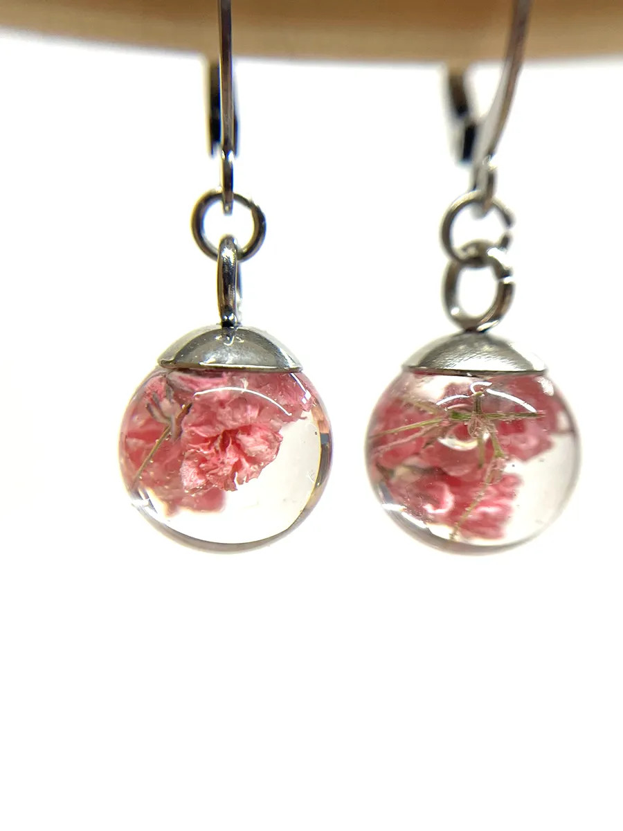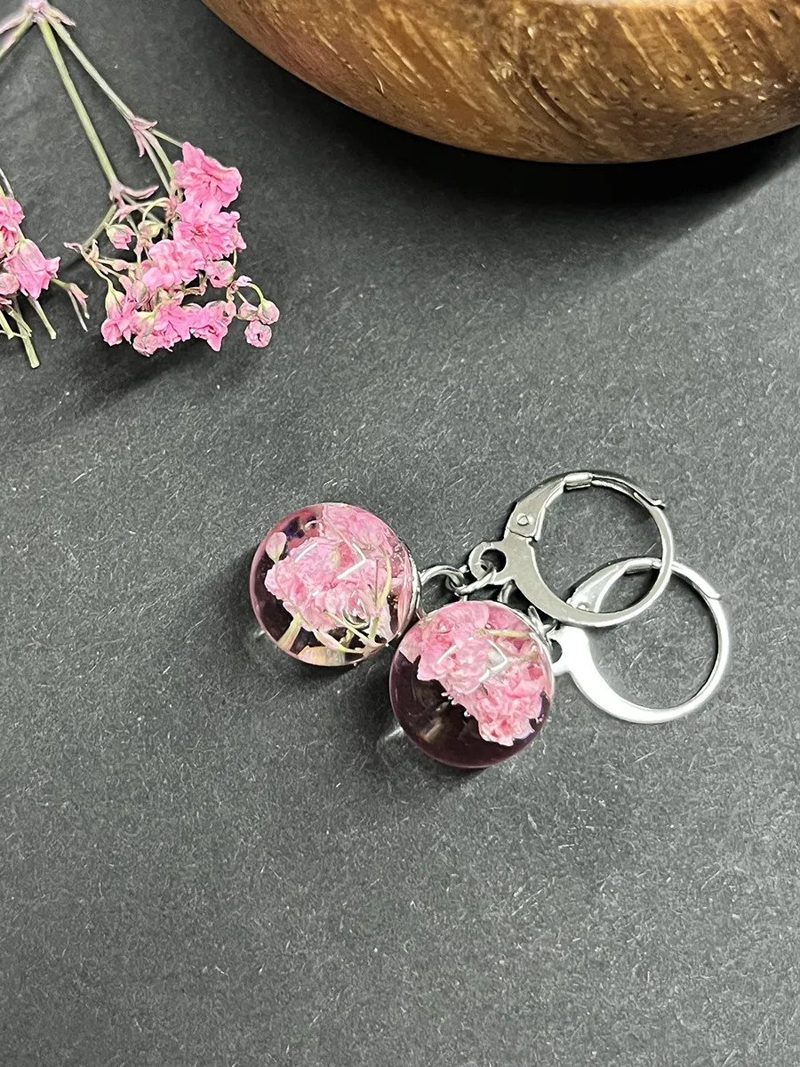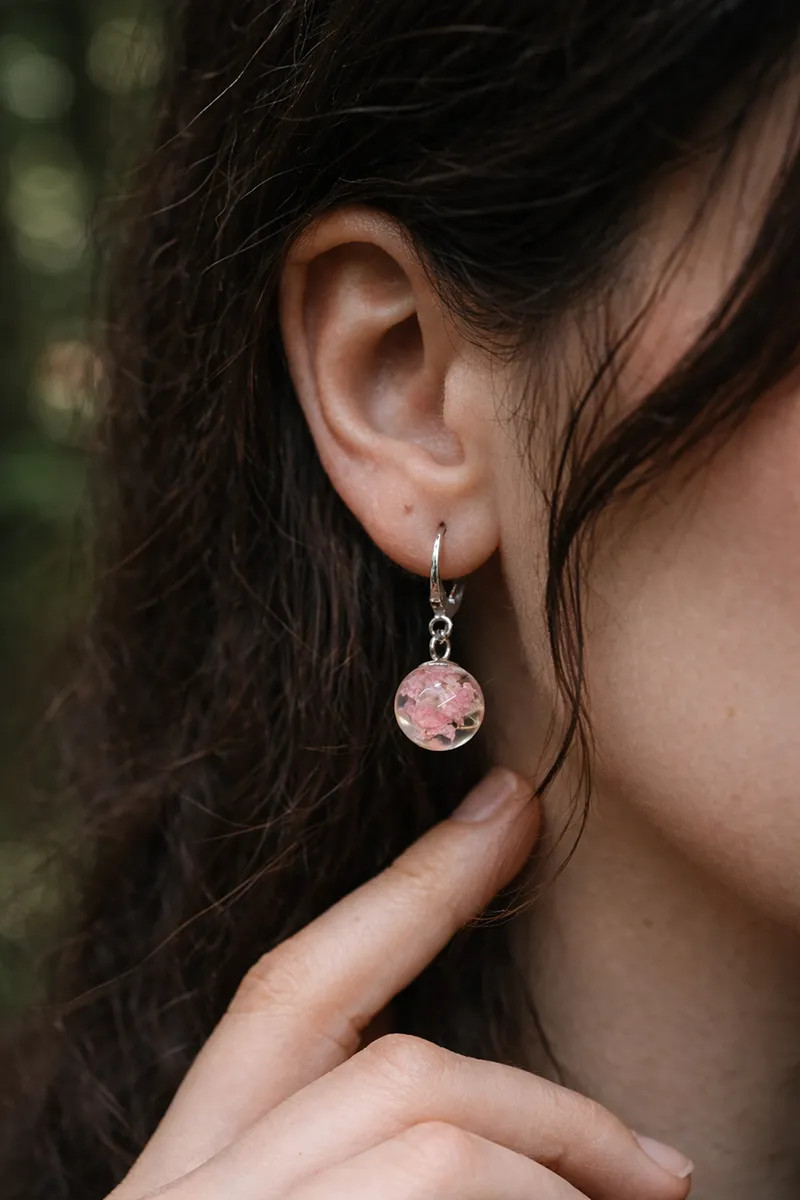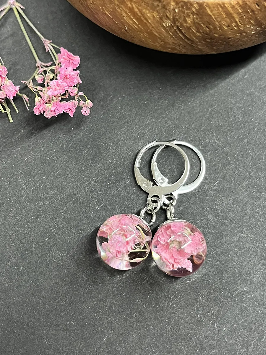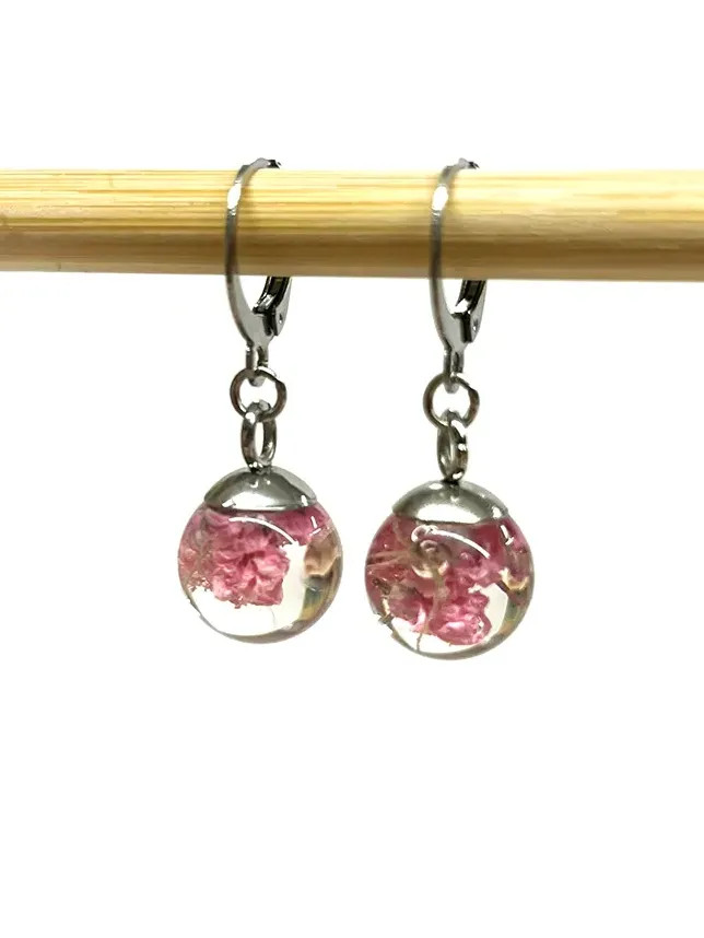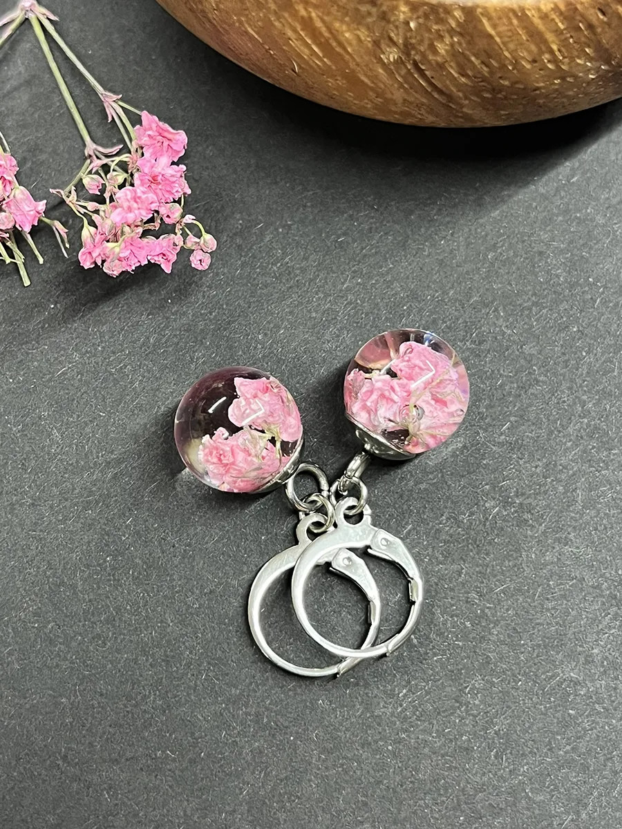 Jemné a něžné puzetové náušnice, ve kterých jsou uchovány pravé růžové květy Nevěstina závoje v průhledné pryskyřici. Každý pár je unikátní a nese kousek přírody. Perfektní volba pro každodenní nošení i speciální příležitosti.