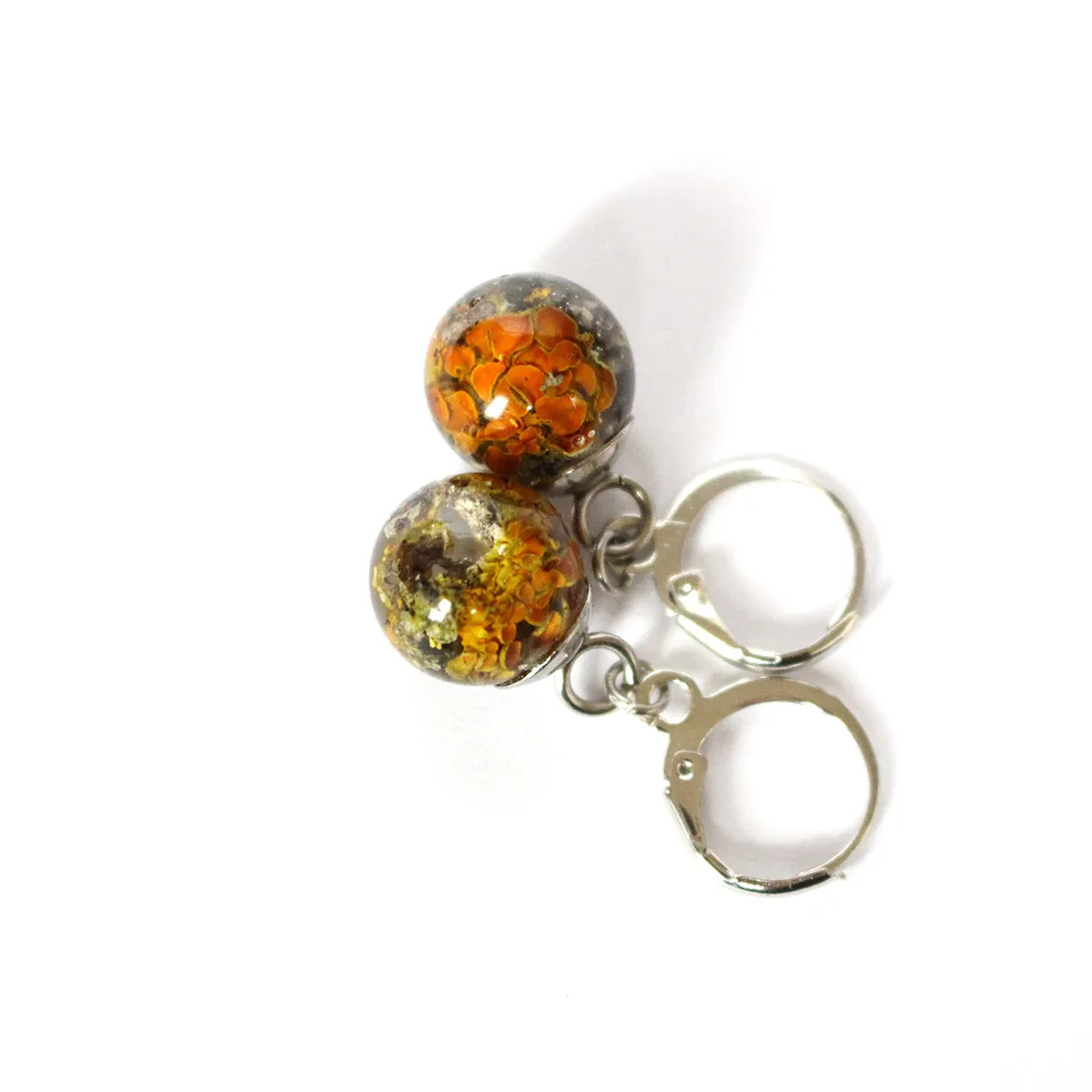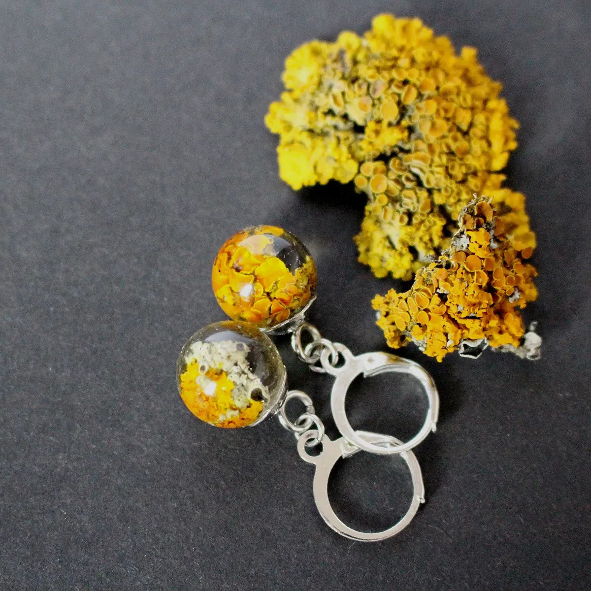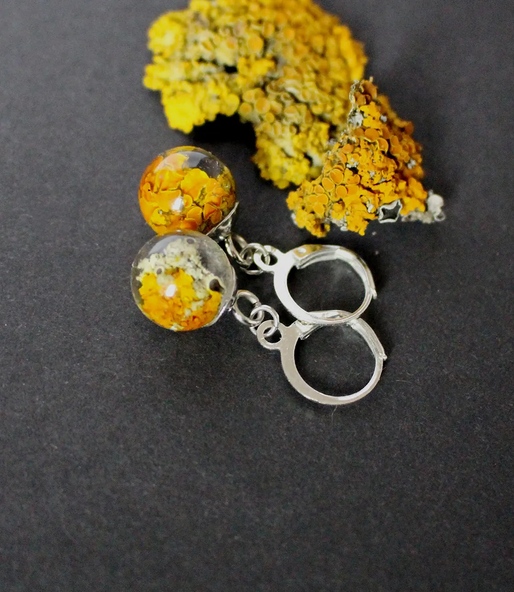Visací náušnice obsahují skutečný lišejník terčovník zední (Xanthoria parietina), pečlivě zalitý do čiré pryskyřice, která zvýrazňuje jeho přirozenou strukturu i charakteristické oranžovo-žluté odstíny.
