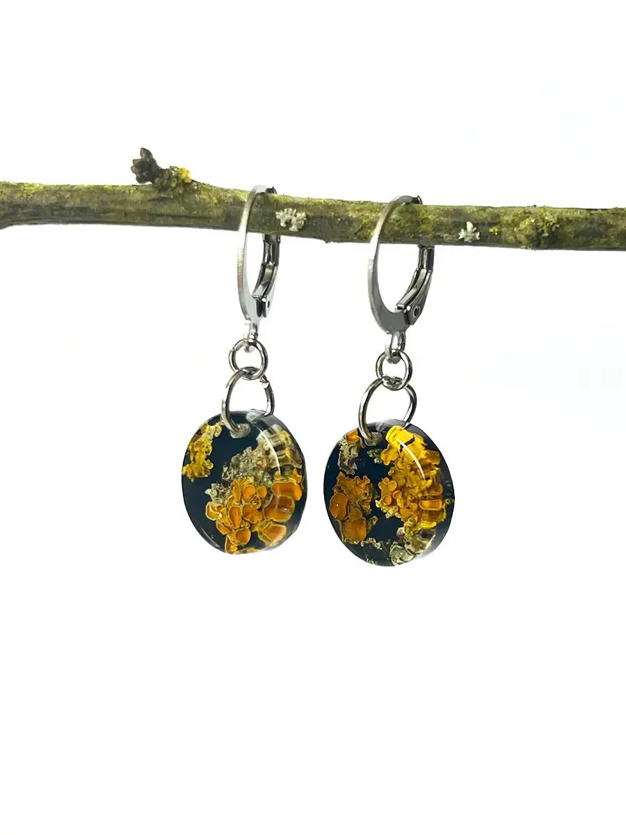 Nevšední a výrazné náušnice, ve kterých se ukrývá skutečný lišejník. Zalitou pryskyřicí vynikne jeho jedinečná struktura i syté barvy, které působí kontrastně a přitahují pozornost. Každý pár je originál, stejně jedinečný jako samotná příroda, z níž pochází.