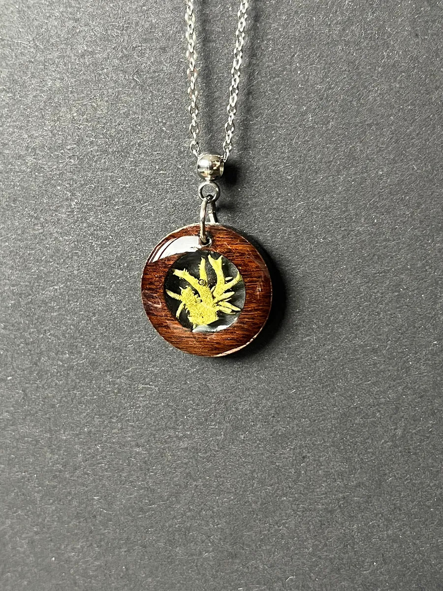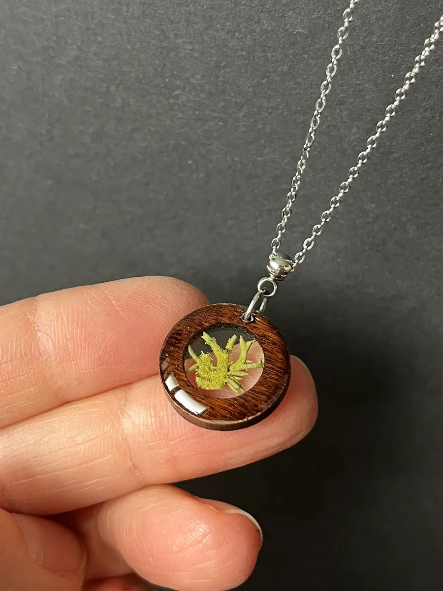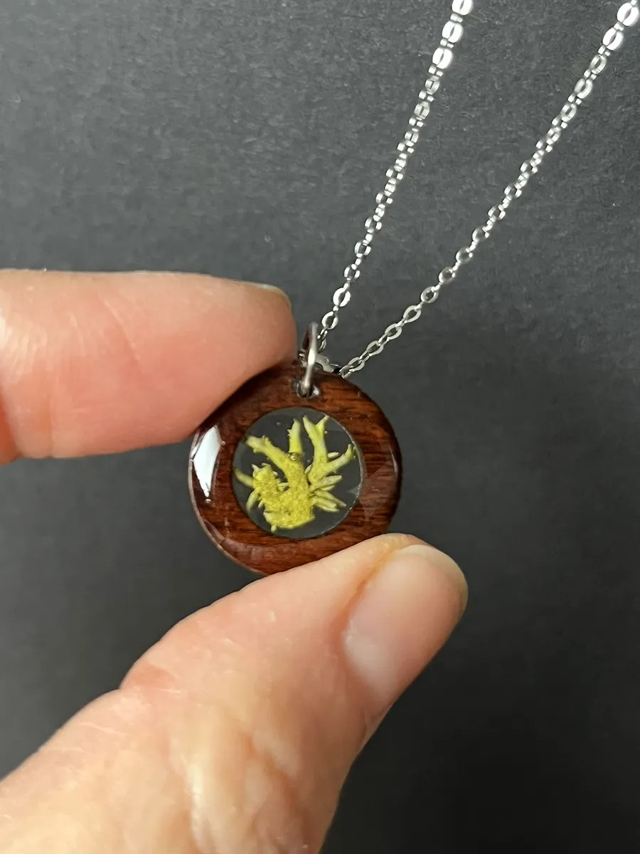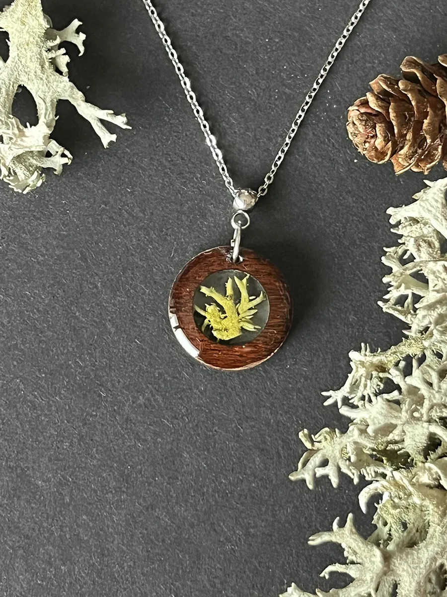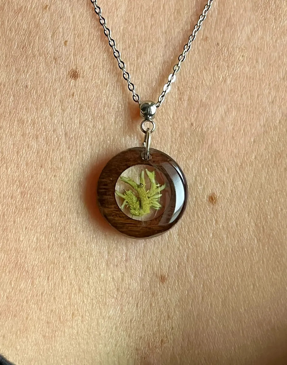 Tento přívěsek v sobě ukrývá malý fragment přírody. Pravý lišejník Větvičník je pečlivě zasazen do dřeva a zalit do čiré pryskyřice, která zvýrazňuje jeho přirozenou strukturu a barvu.