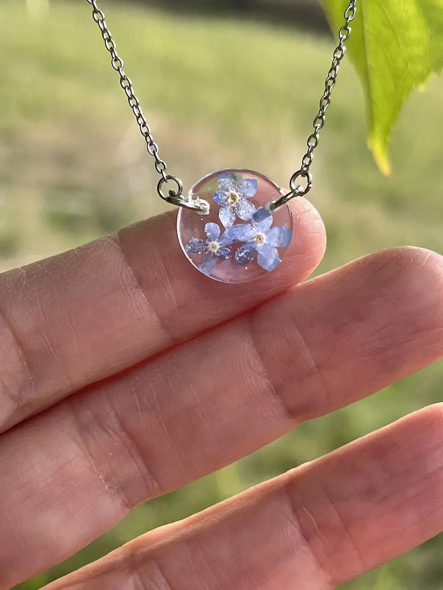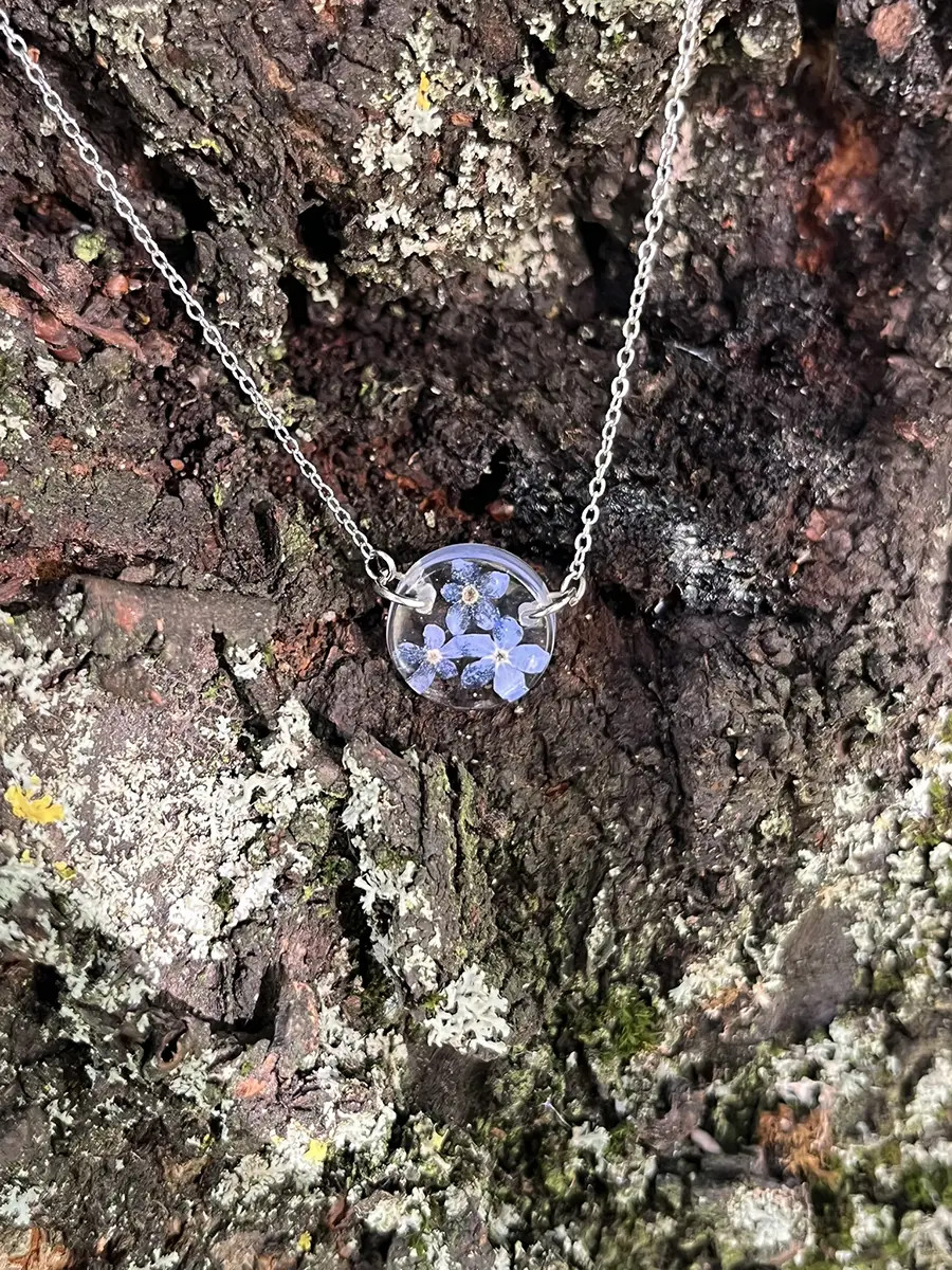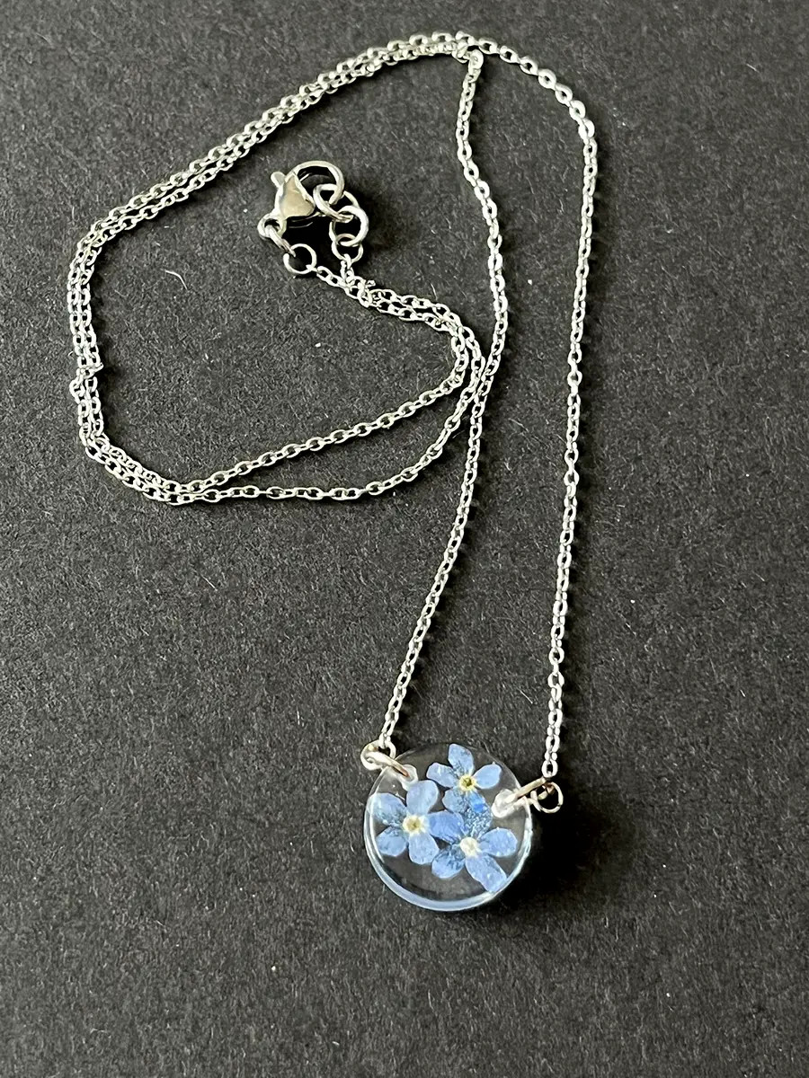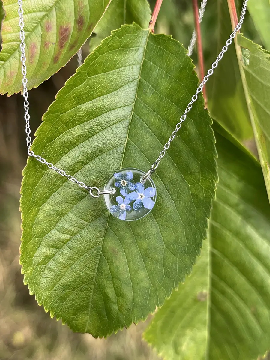 Jemný přívěsek s pravými pomněnkami zalitými v křišťálové pryskyřici. Modré květy pomněnky symbolizují lásku, věrnost a vzpomínku, díky čemuž se šperk stává osobitým dárkem pro milovanou osobu. Přívěsek je zavěšen na jemném řetízku a díky minimalistickému designu se hodí pro každodenní nošení i slavnostní příležitosti.