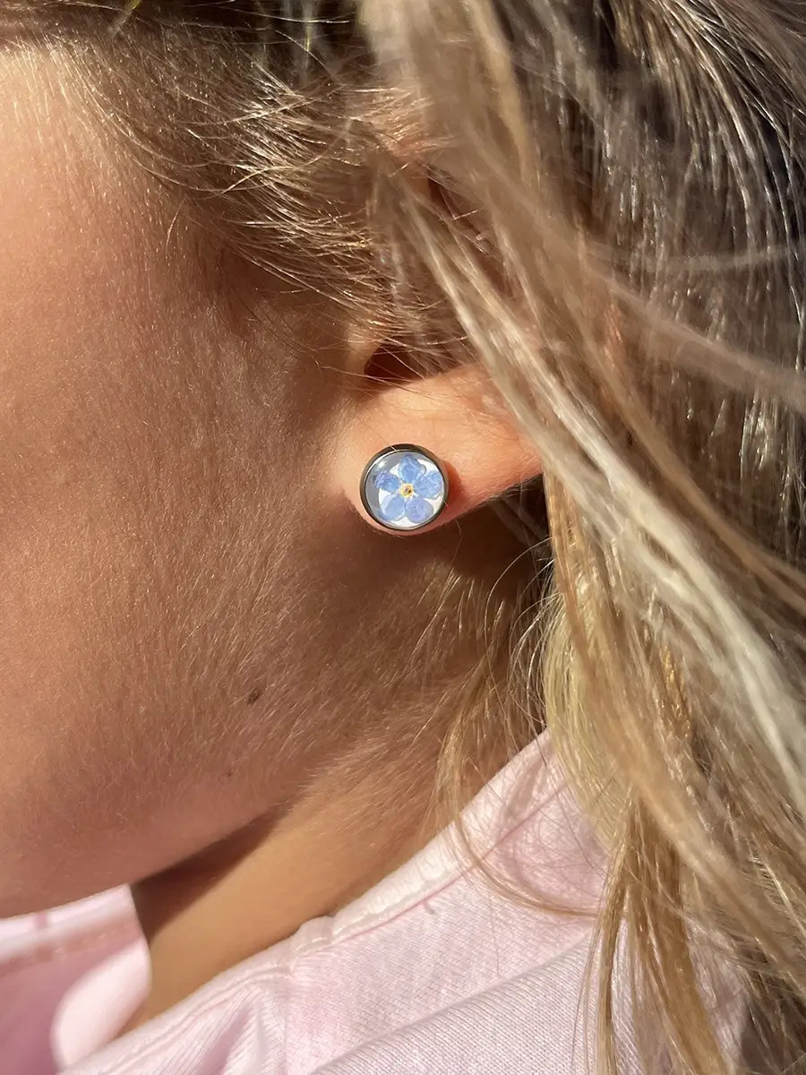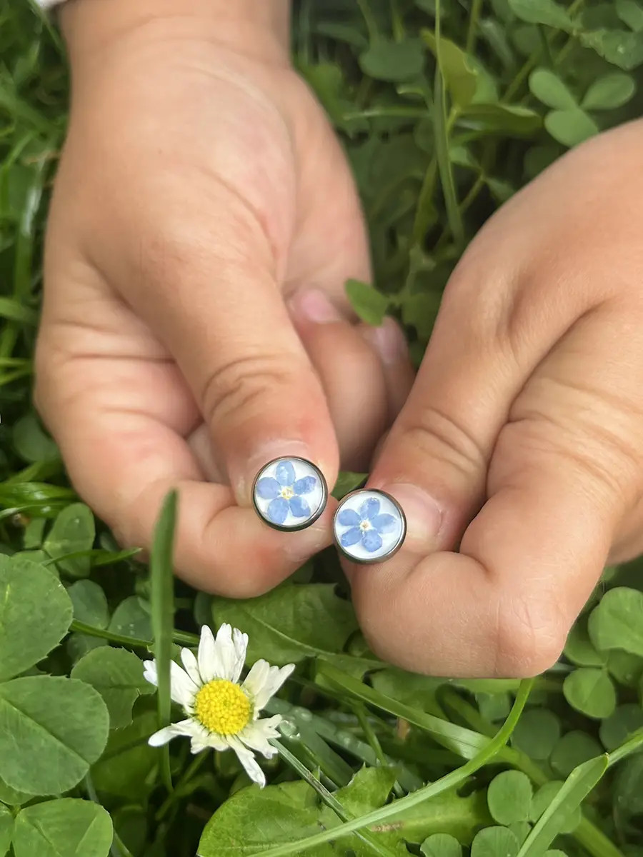 Puzety s květem Pomněnky – originální náušnice inspirované přírodou. Modré květy s jemným žlutým středem na světlém podkladu. Ideální jako dárek pro milovnice květinových motivů a jemných šperků. Pro svou menší velikost jsou vhodné pro malé slečny, ale i pro maminky.