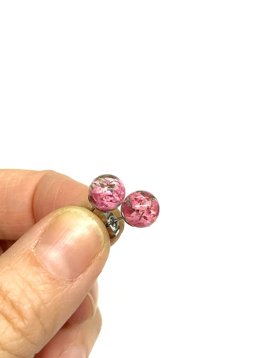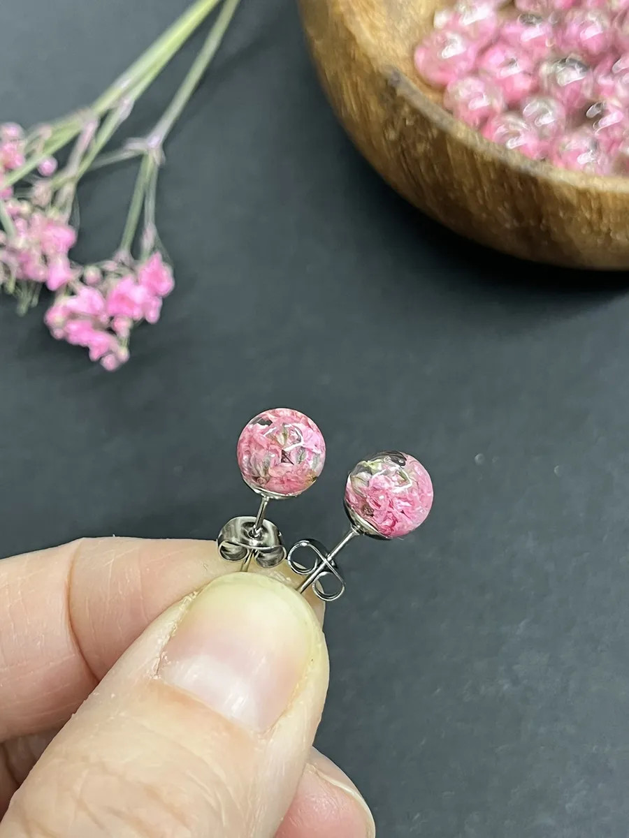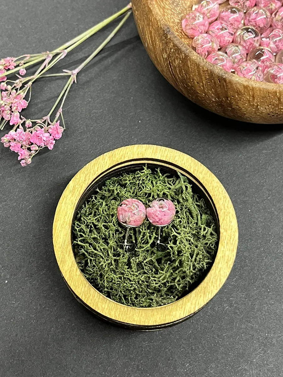 Kuličkové puzetky s drobnými kvítky růžového Nevěstina závoje. Ideální jako dárek pro milovnice květinových motivů a jemných šperků. Díky pravým květům se může vzhled jednotlivých náušnic lišit.