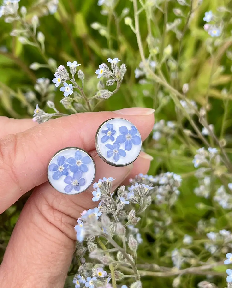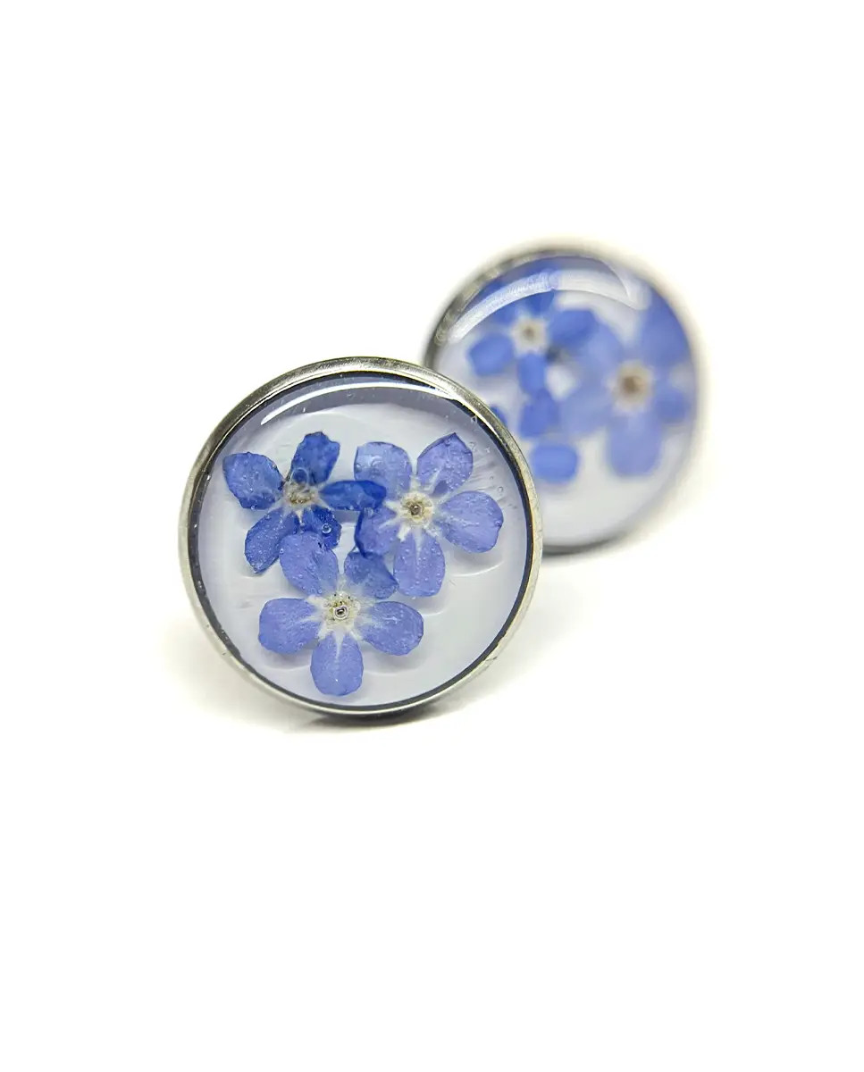Puzety s květem Pomněnky – originální náušnice inspirované přírodou.
