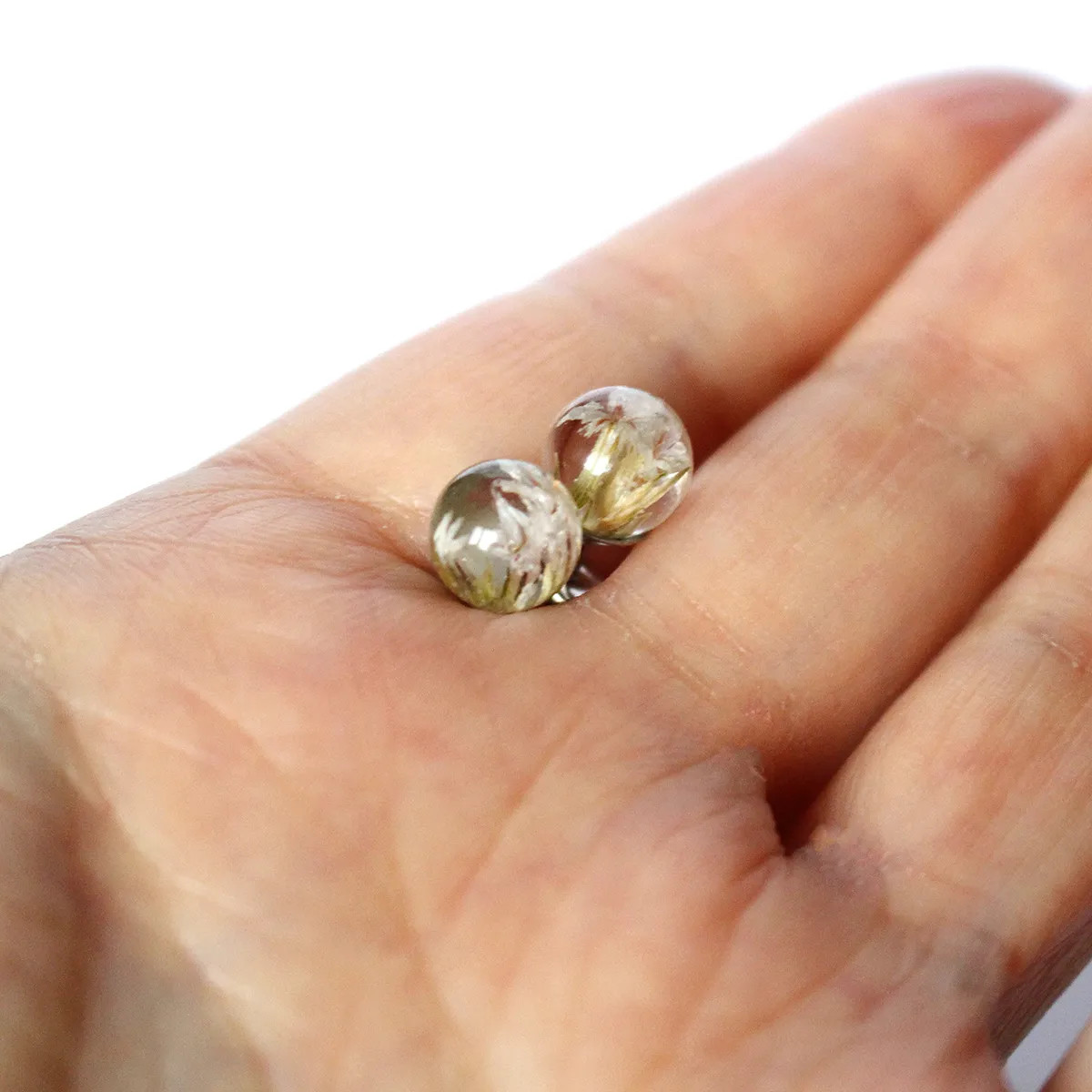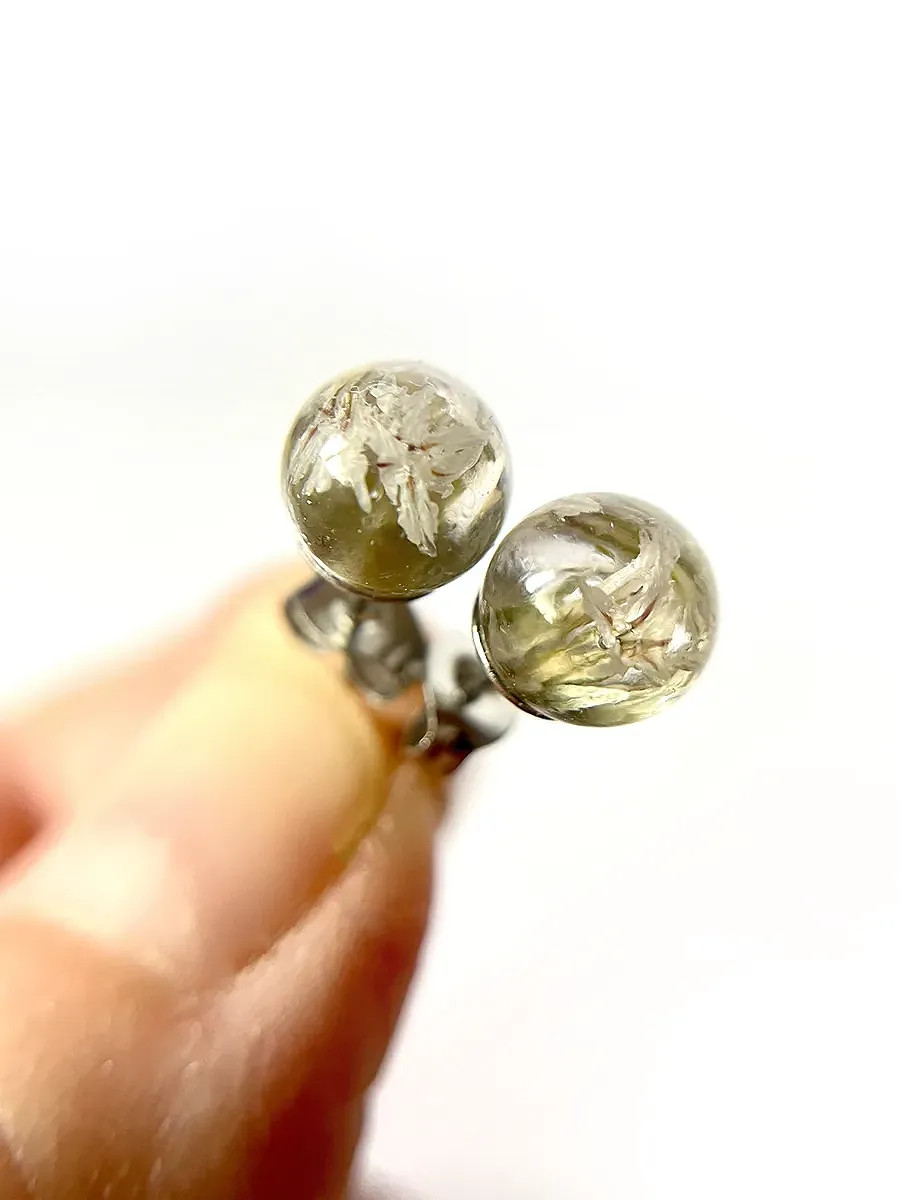 Tyto ručně vyráběné puzetové náušnice obsahují skutečný květ Suchobýlu tatarského, pečlivě zalitý do čiré pryskyřice, která zvýrazňuje jeho přirozenou strukturu a jemné tóny.